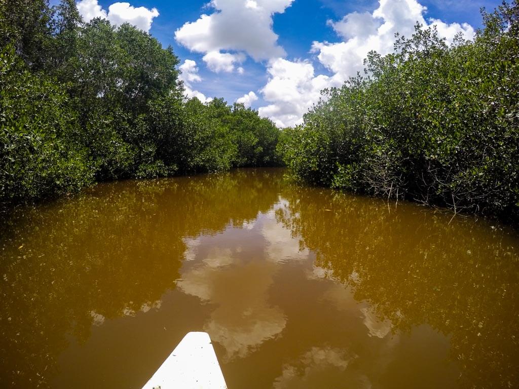 Le mangrovie si intrecciano in modo talmente fitto da rendere quasi impossibile il nostro passaggio. I rami si estendono al punto di sembrare braccia tese a bloccarci la strada. E sono loro, i rami e le radici, a dare all’acqua questo colore marrone-rossastro.